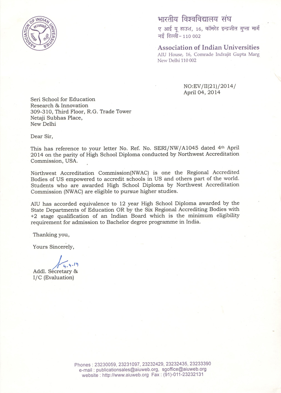 SERI, in collaboration with NWAC / Cognia, is supported by key central approvals and equivalency recognitions in India. These approvals ensure that students completing the NWAC American High School Diploma are able to access higher education opportunities in India in line with national regulations.