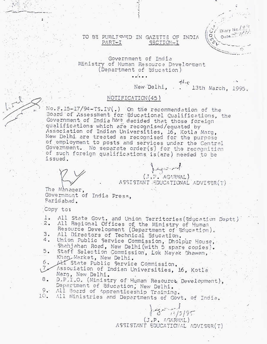 Gazette Notification No. F15-17/94-TS-IV dated 13 March 1995 (Ministry of Human Resource Development, New Delhi).