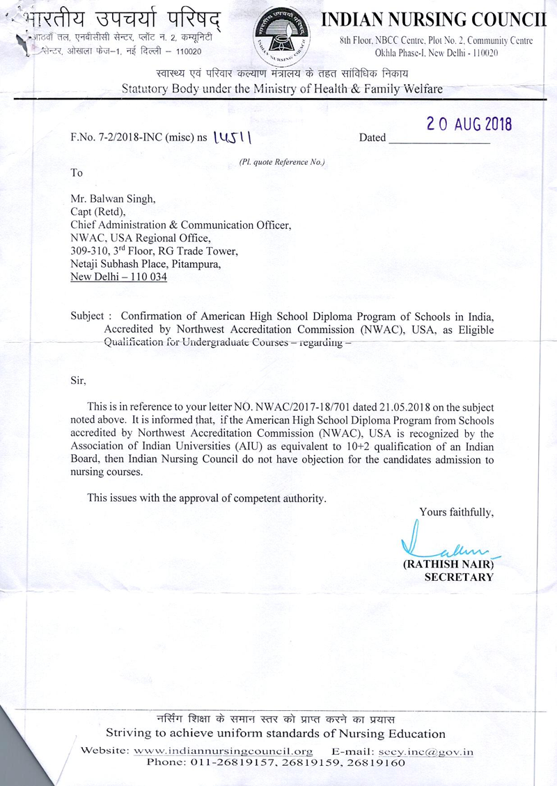 Recognition and acceptance of NWAC qualifications by the Indian Nursing Council for relevant nursing education pathways.
