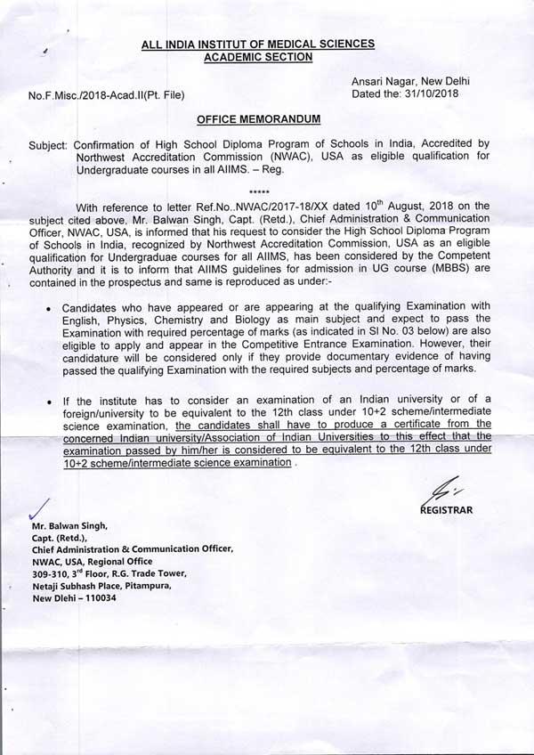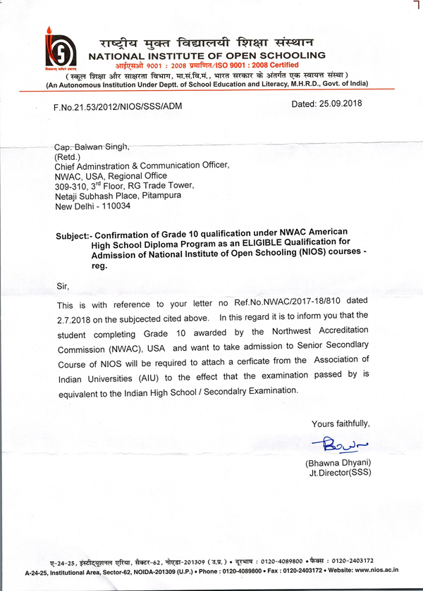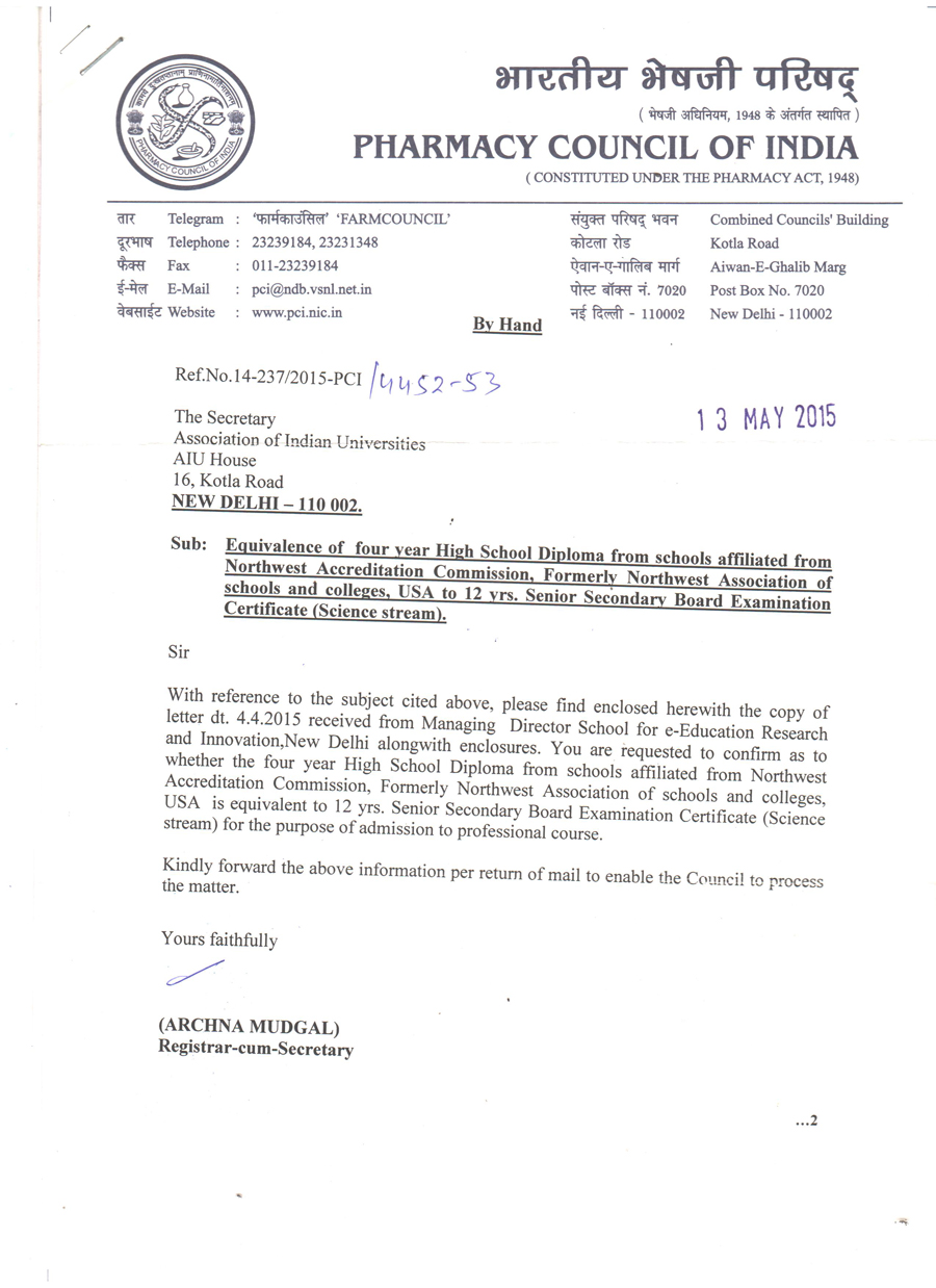 Educational certificates of NWAC, USA are widely recognised and accepted by various national and state universities and education boards across India. Extracts from letters of such universities/boards are available state-wise below.