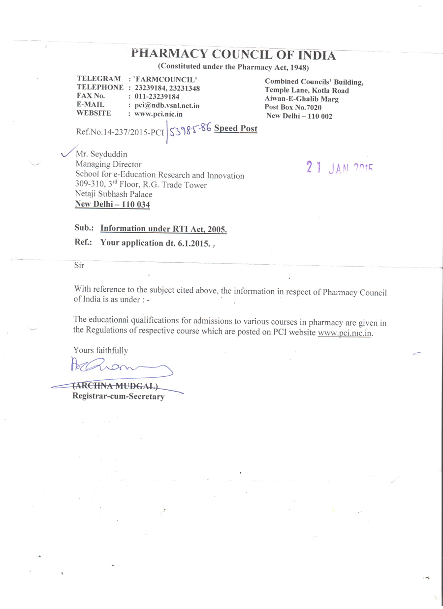 PHARMACY COUNCIL OF INDIA. 21.01.2015