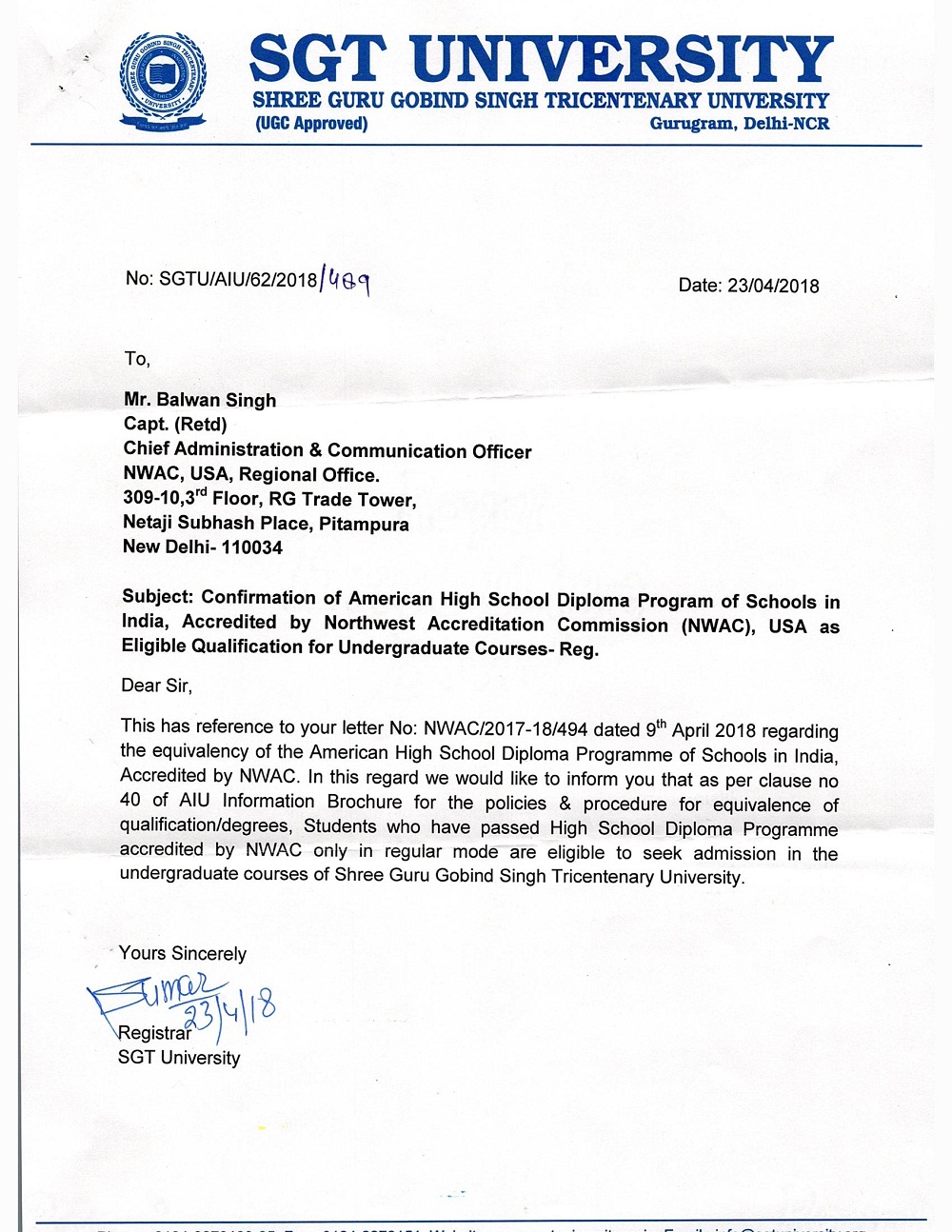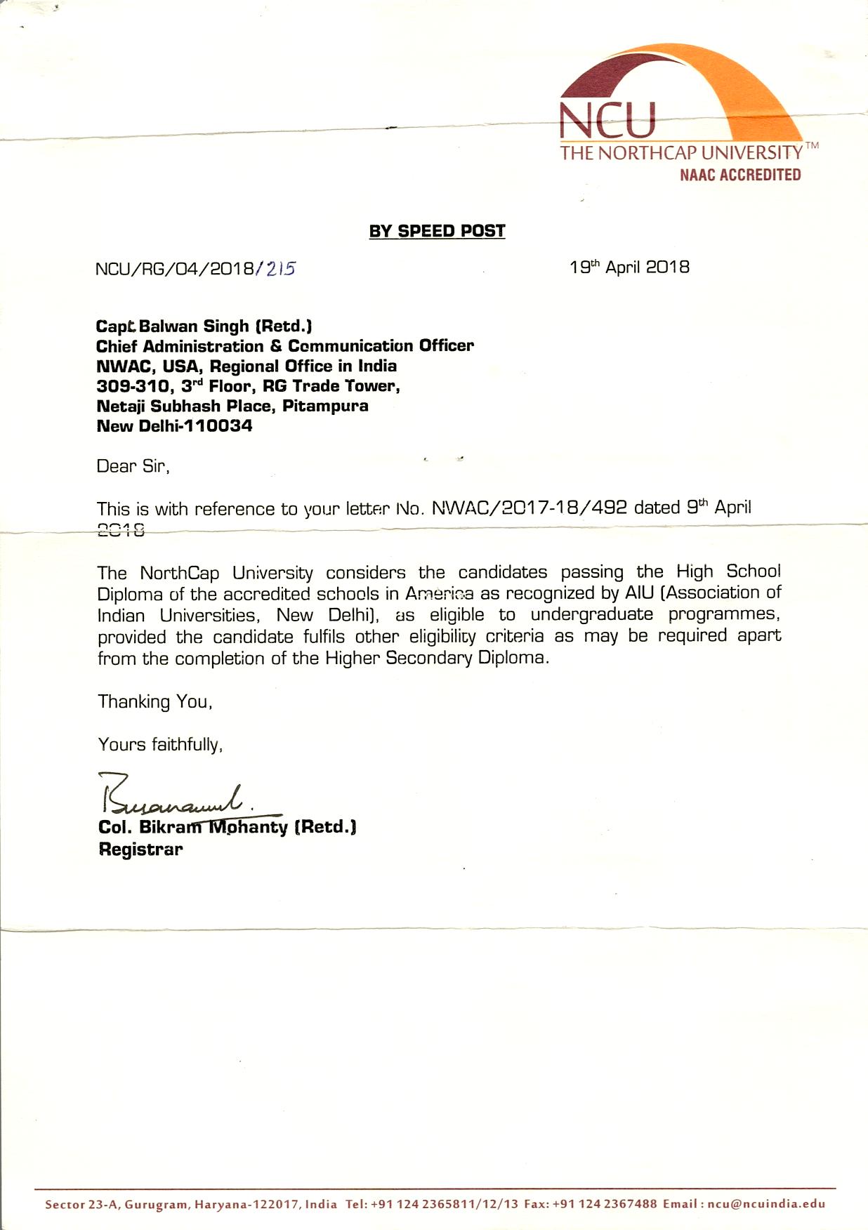 Educational certificates of NWAC, USA are widely recognised and accepted by various national and state universities and education boards across India. Extracts from letters of such universities/boards are available state-wise below.