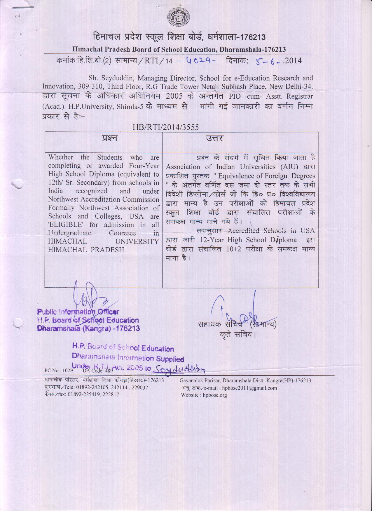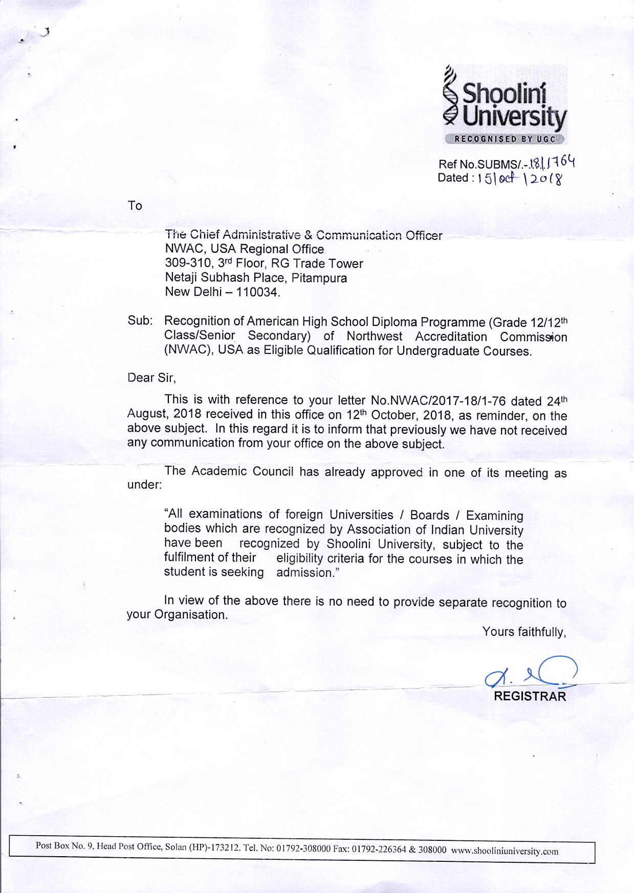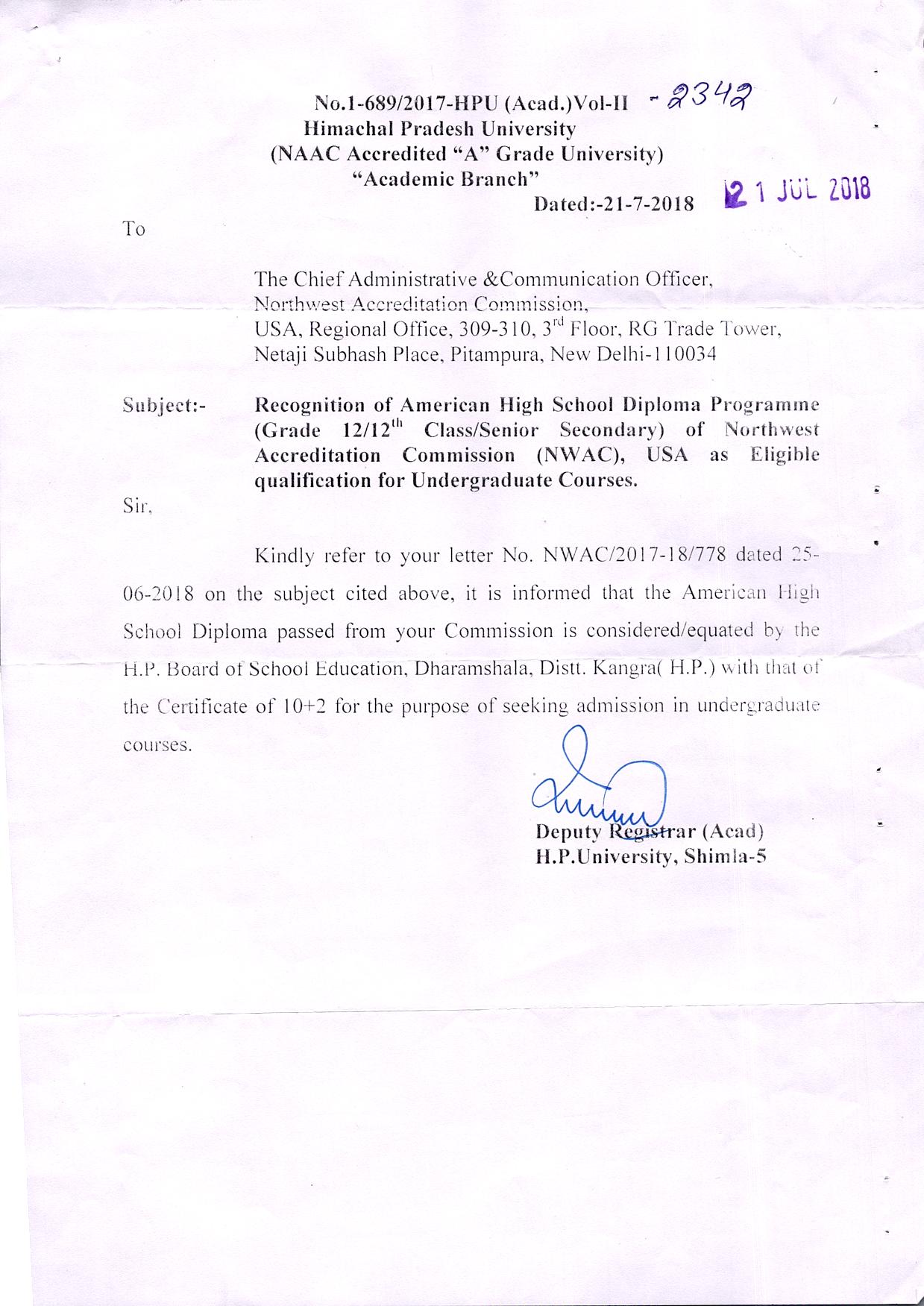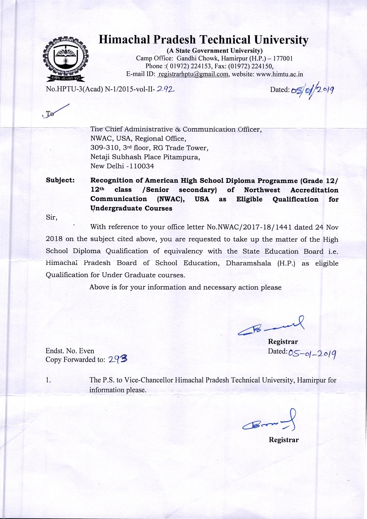 Universities and councils in Himachal Pradesh have accepted NWAC high school credentials.