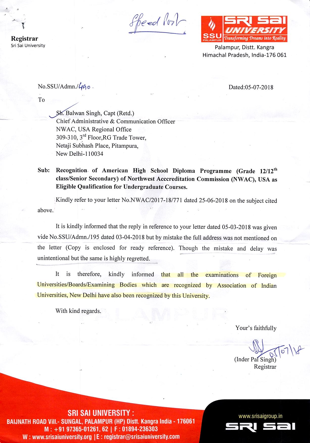 Educational certificates of NWAC, USA are widely recognised and accepted by various national and state universities and education boards across India. Extracts from letters of such universities/boards are available state-wise below.