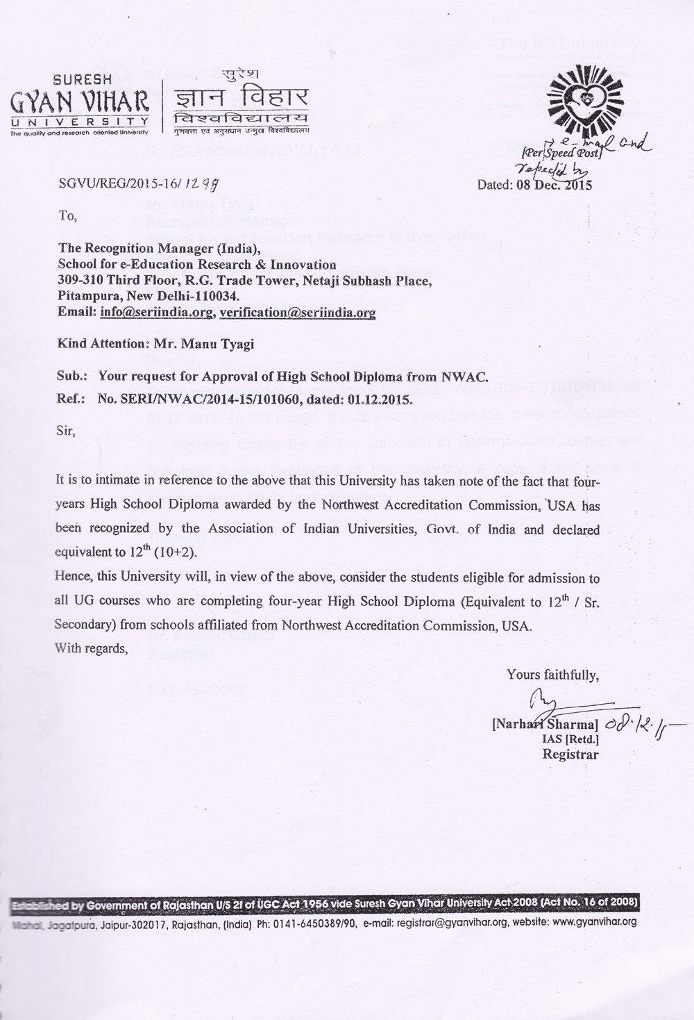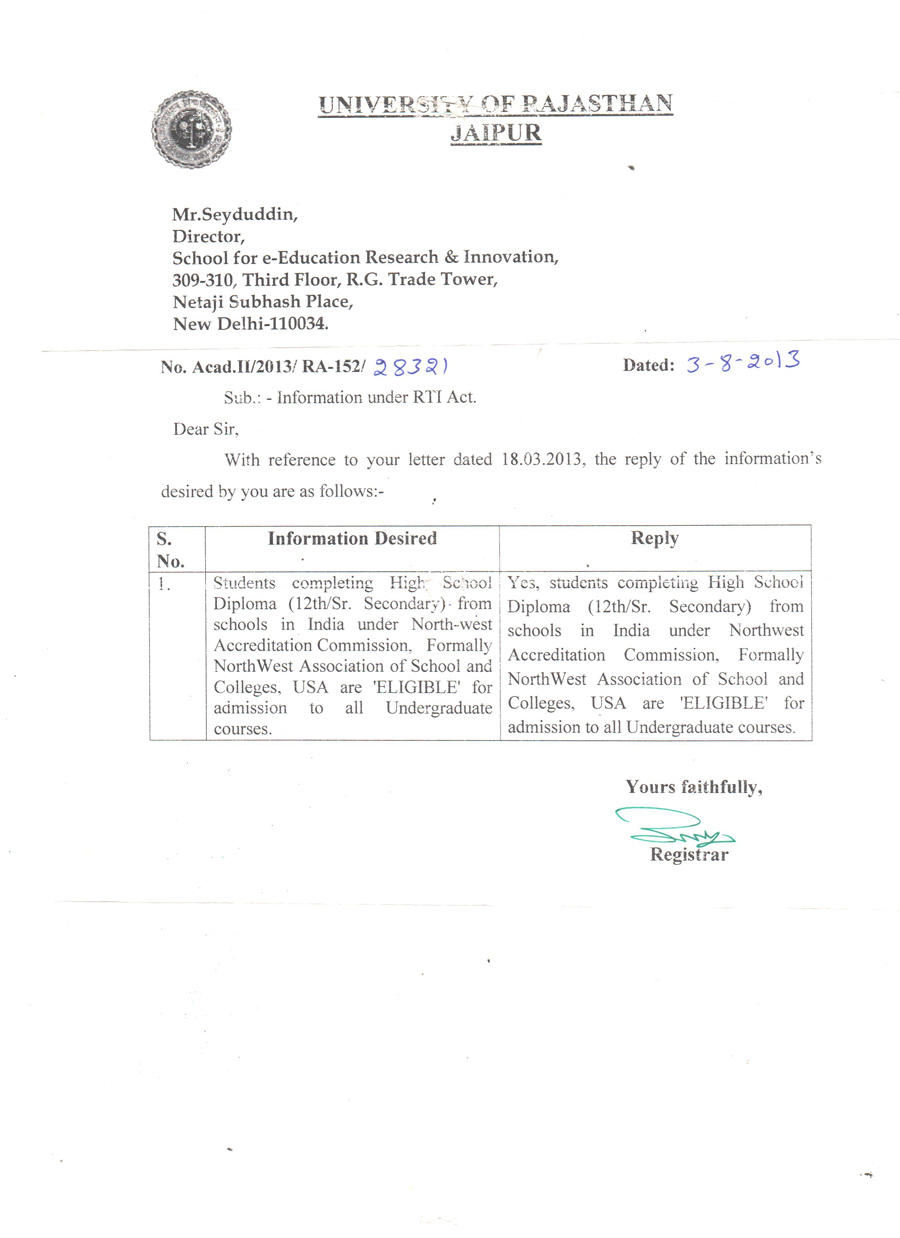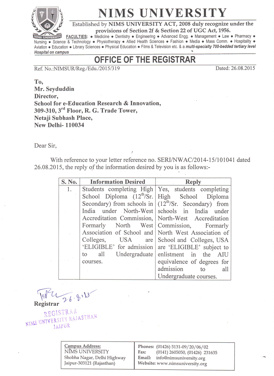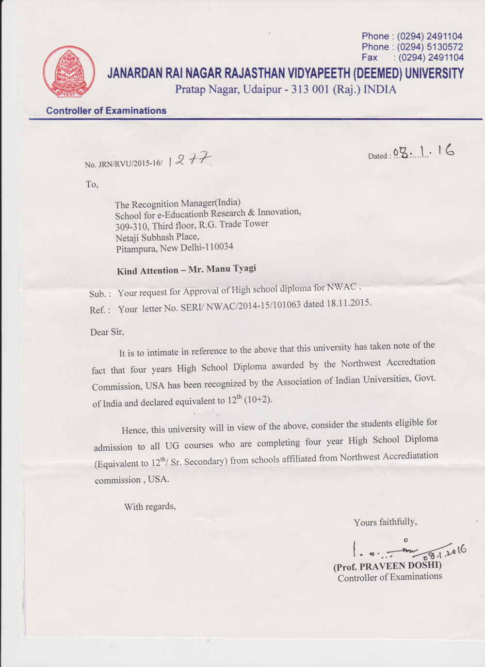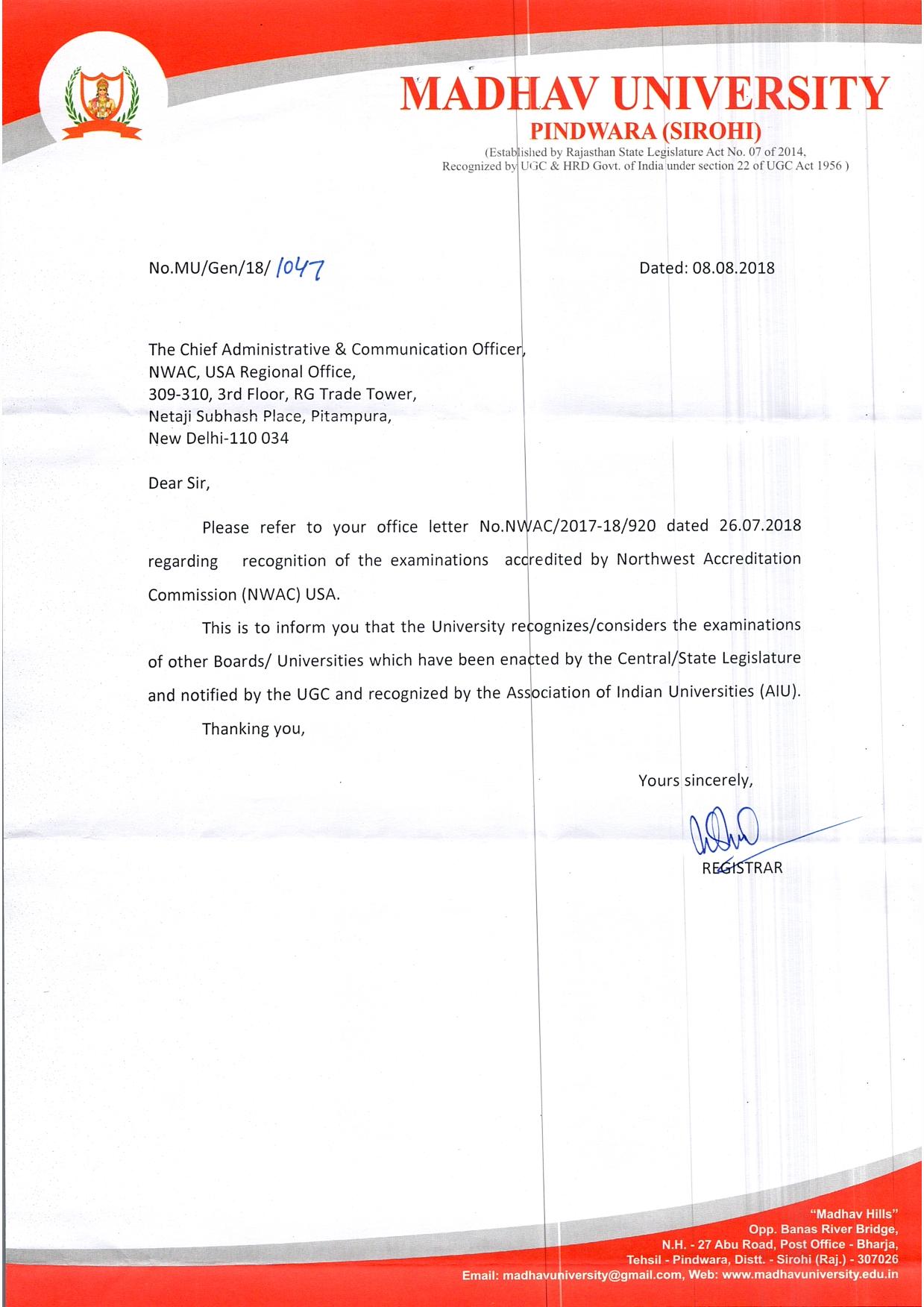 Educational certificates of NWAC, USA are widely recognised and accepted by various national and state universities and education boards across India. Extracts from letters of such universities/boards are available state-wise below.