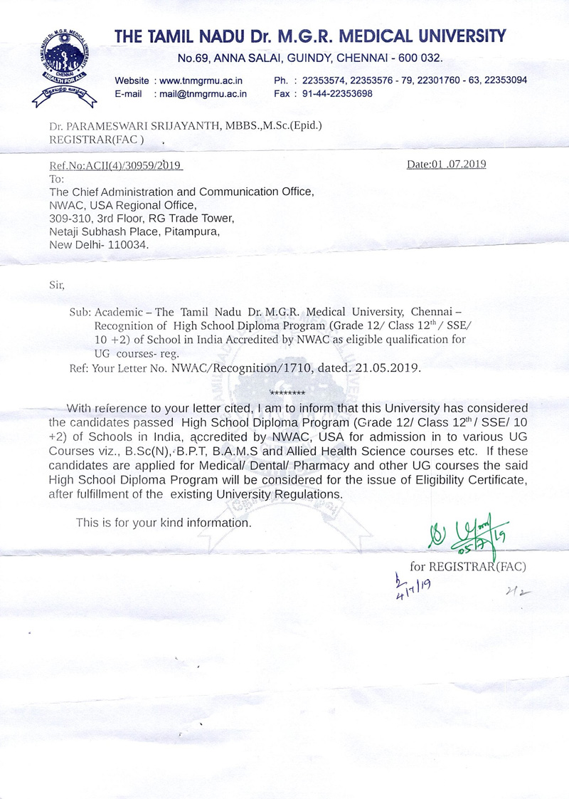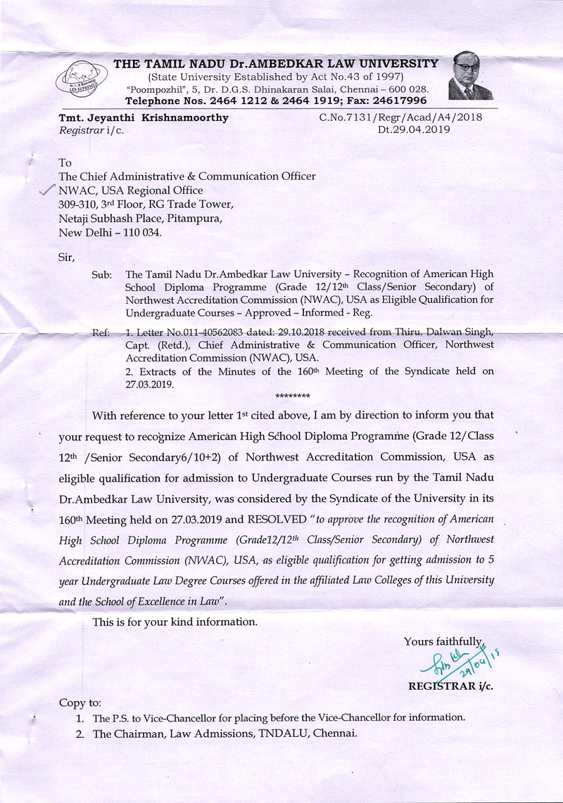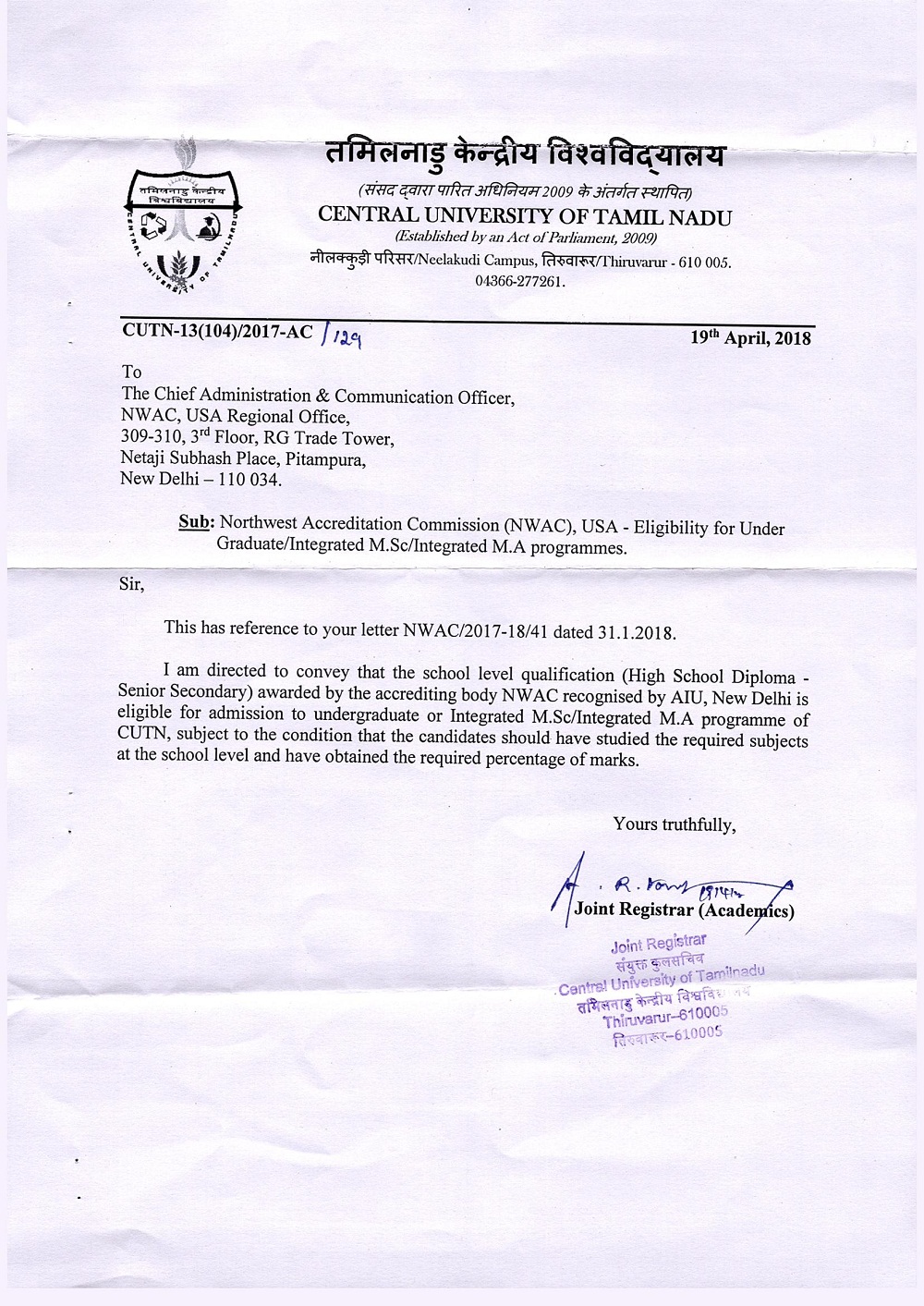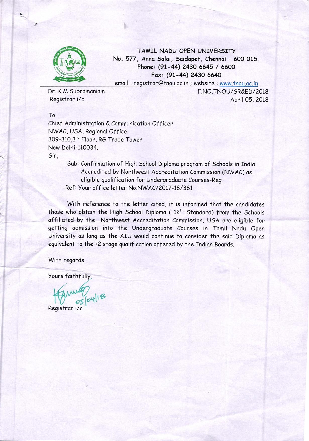 Universities and boards in Tamil Nadu have considered NWAC high school credentials for admissions.